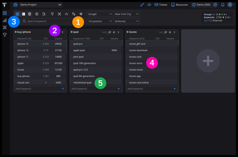 Thundo allows you to collect keywords without an active ad campaign or linking Google Search Console account. Also, you can pull keywords and get tons of ideas not only from Google Keywords Planner, but also from other sources and keywords researching methods including search suggestions, keywords that already bring you traffic etc. and refine semantics online while collaborating with teammates.